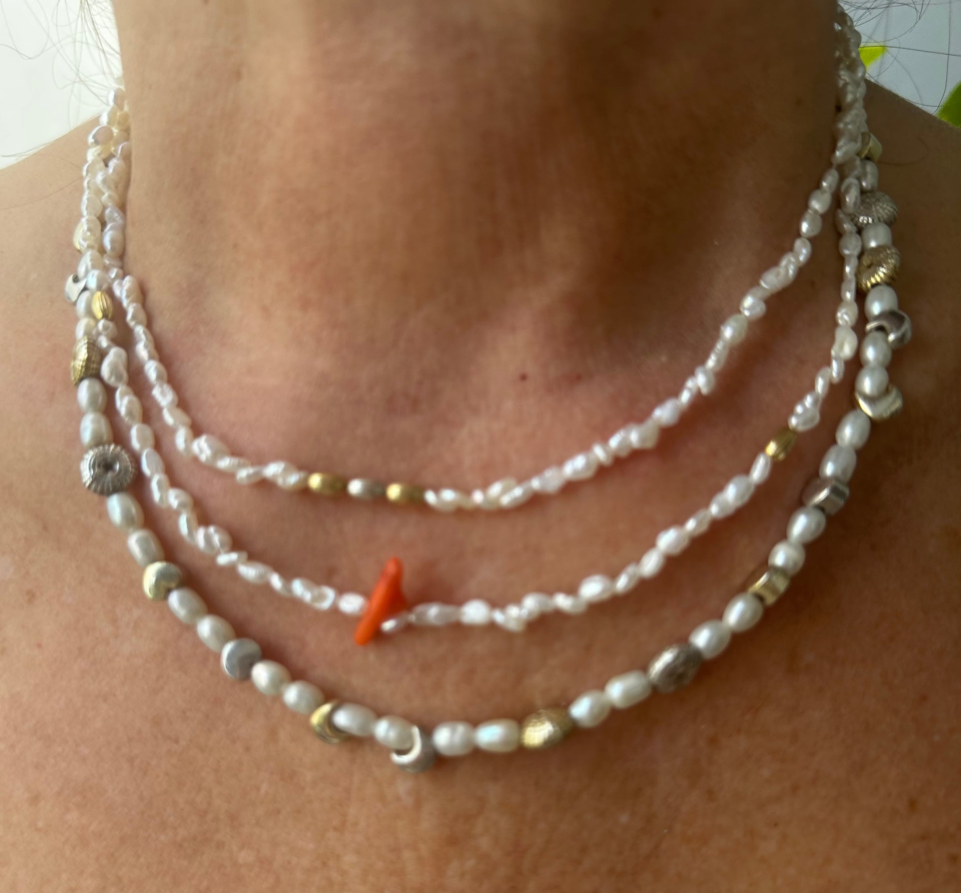 Elegant necklace made of natural 3.5mm baroque freshwater pearls, length 43cm + 5cm extender. At the center a natural color—two gold-plated cylinders add a modern touch of balance and subtle shine. A timeless piece that beautifully blends classic elegance with contemporary design