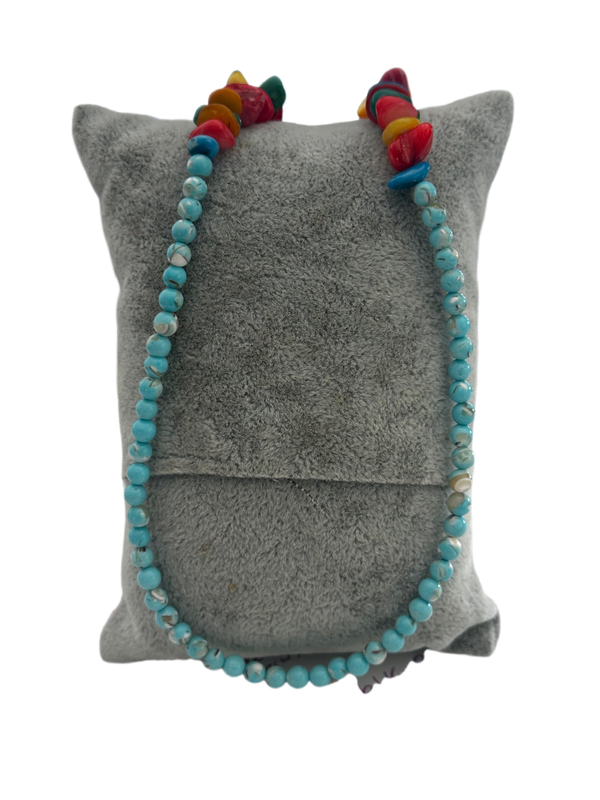Bring the ocean’s charm to your everyday style with this handcrafted necklace, featuring natural aquamarine stones and vibrant, colorful shell accents at the start of each side. Carefully assembled by hand, each piece is unique, highlighting the serene beauty of aquamarine—a stone known for its calming energy and connection to the sea.